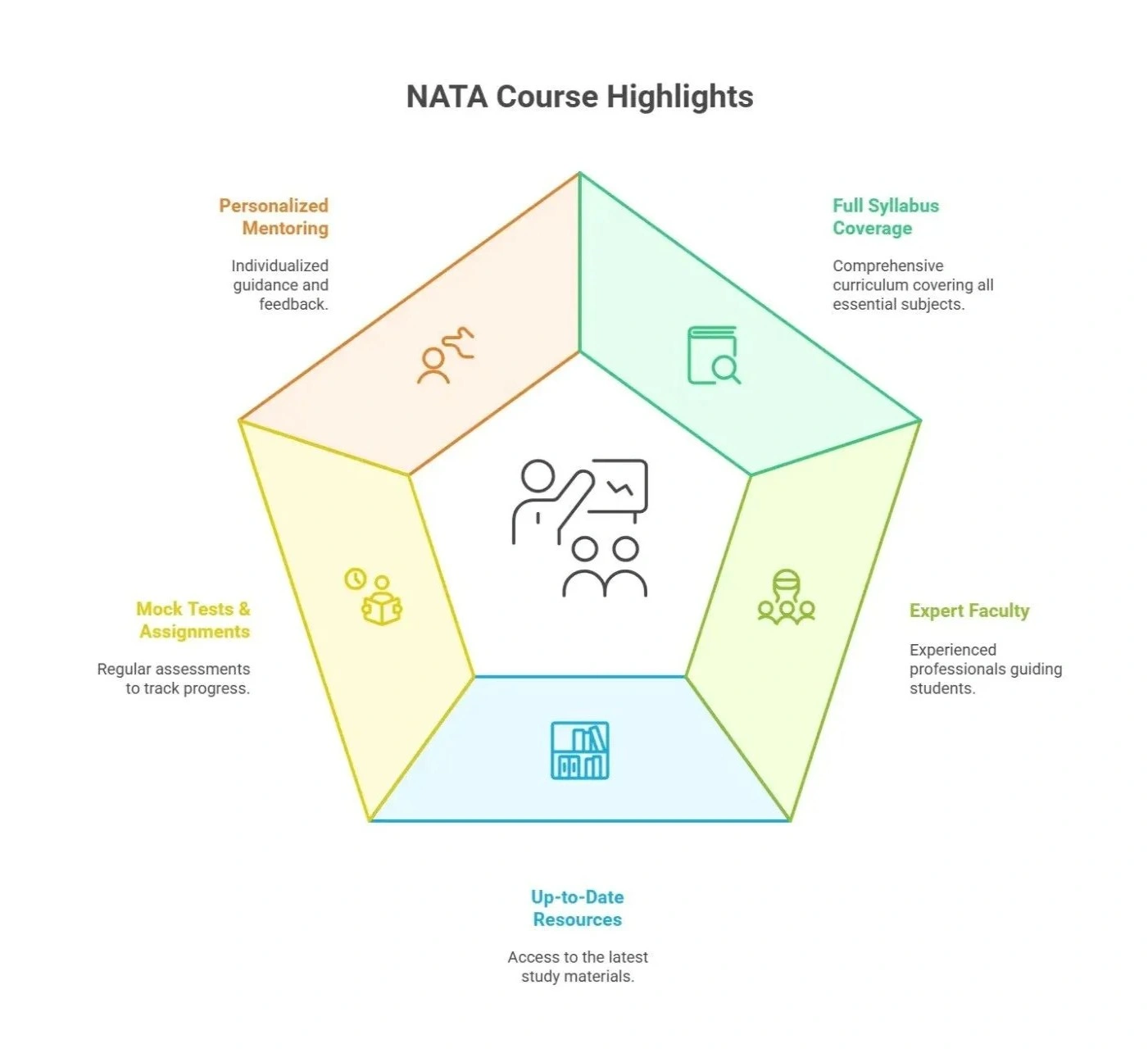 Comprehensive notes, digital resources, e-books, recorded video classes, mock tests, and practice sheets aligned with the NATA syllabus.